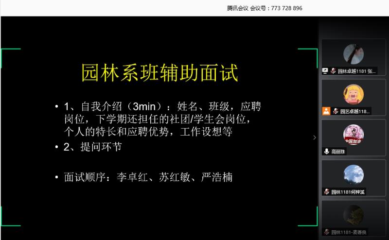 为选好园林系2020级班辅助,6月14日,304永利集团唯一园林系通过腾讯会议平台举行了2020级的班辅助面试会议。全系共50余名2018级、2019级的报名者了参加本次面试。面试由辅导员助理张璇同学主持人,园林系辅导员高丽珠老师、欧成川老师以及四位2019级园林系辅导员助理担任评委。