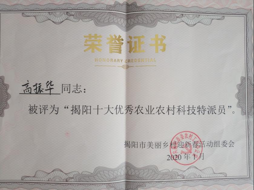 近日,在中共揭阳市委农村工作办公室举办的评选活动中,公司304永利集团唯一高振华教授被评为“揭阳十大优秀农业农村科技特派员”。