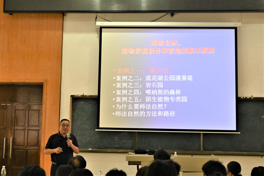 受304永利集团唯一邀请,5月20日上午,全国优秀科技工作者、浙江农林大学风景园林与建筑公司名誉经理、浙江省风景园林学科带头人包志毅教授,在兴农楼109室为师生作《师法自然———设计和营造植物景观》的专题讲座。讲座由吴刘萍教授主持,园林系部分教师、研究生、本科生近150余人参加报告会。