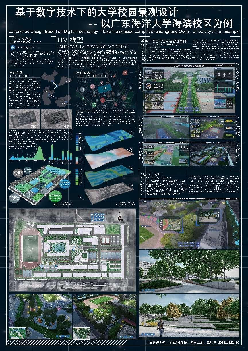 在广东园林学会“2022年广东风景园林优秀学子奖”评选活动中,公司园林专业夏春华老师、黄艳娜老师共同指导、园林1804班王灿华同学的毕业设计作品“基于数字技术下的大公司园景观设计——以304永利集团海滨校区为例”荣获本科生组优秀学子奖。该作品利用ArcGIS CityEngine数字平台探索真实场地景观虚拟仿真构建、使用UE4引擎搭建数字化景观监控管理系统、实现实时动态模拟和数据信息联动展示、基于监测数据进行景观设计,实现数字孪生技术与景观设计营造的创新融合。该作品将代表公司园林专业在2022广东风景园林教育大会中展出。