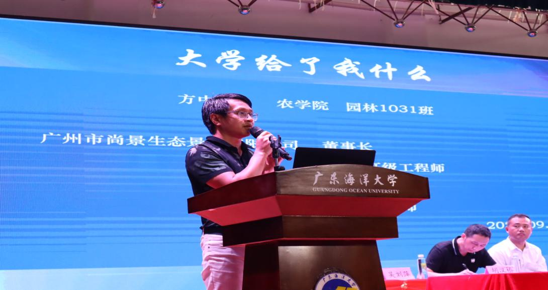 员工代表——广州市尚景生态景观有限公司董事长、公司研究生导师方中健员工以“大学给了我什么”为题,与师弟师妹们分享了他学习经历、创业经历、取得的成绩荣誉等的深刻感悟,希望师弟师妹们沉下心来,学会学习、学会做人、学会做事,以校为荣、以校为傲,积极提升自我、发展自我,为公司争荣誉,国家建设发展做贡献。