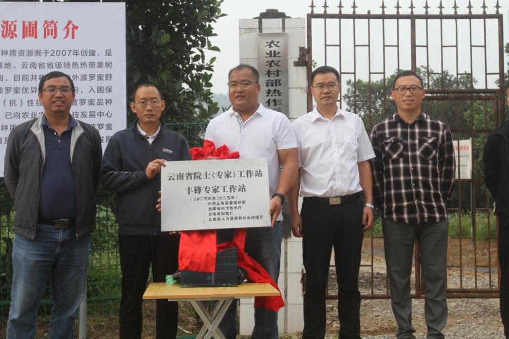12月11日-13日,304永利集团唯一园艺系丰锋、李国鹏一行到云南省红河热带农业科学研究所交流学习,在所党委书记、所长丰玉云和“云南省丰锋专家工作站”项目负责人岳建伟等领导的陪同下,首先举行“云南省丰锋专家工作站”揭牌仪式,然后实地参观了研究所菠萝蜜、香蕉、柚子、油梨、橡胶等种质资源圃和试验基地,同时到南溪、蚂蝗堡等菠萝蜜种植基地调研,详细了解种植户面临的技术问题并给出针对性的解决方案。随后,双方开展交流座谈。